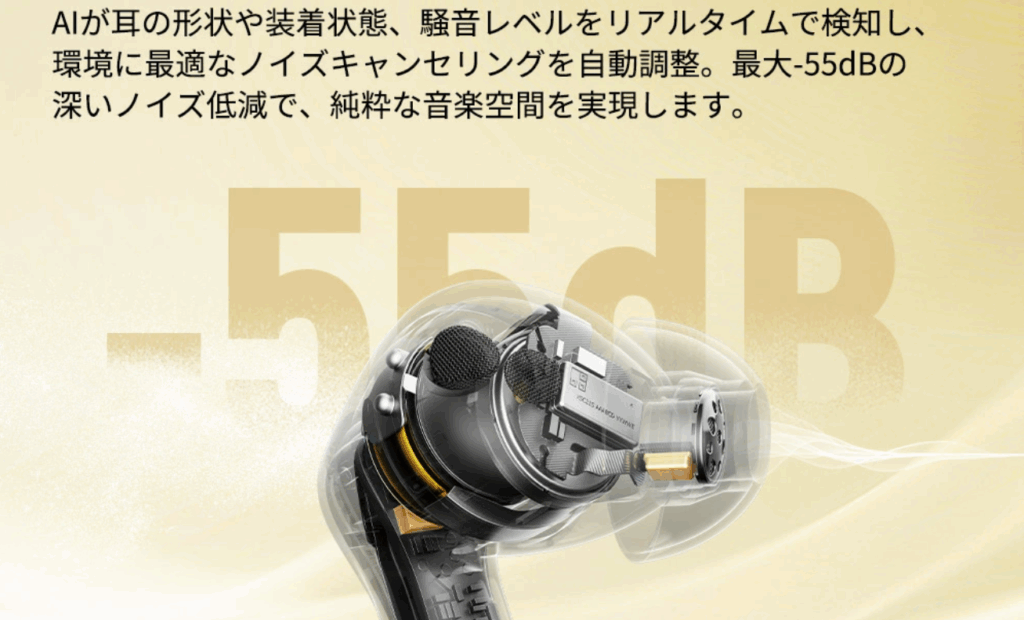 Air5 Pro+はSOUNDPEATS史上最高のノイズキャンセリング性能を誇る。最大で-55dBのAI適応型(アダプティブ)ノイズキャンセイリングを搭載している。最大-55dBがどれくらいすごいのかは俺は分からないけど、ノイズキャンセリングが強いに越したことは無い。