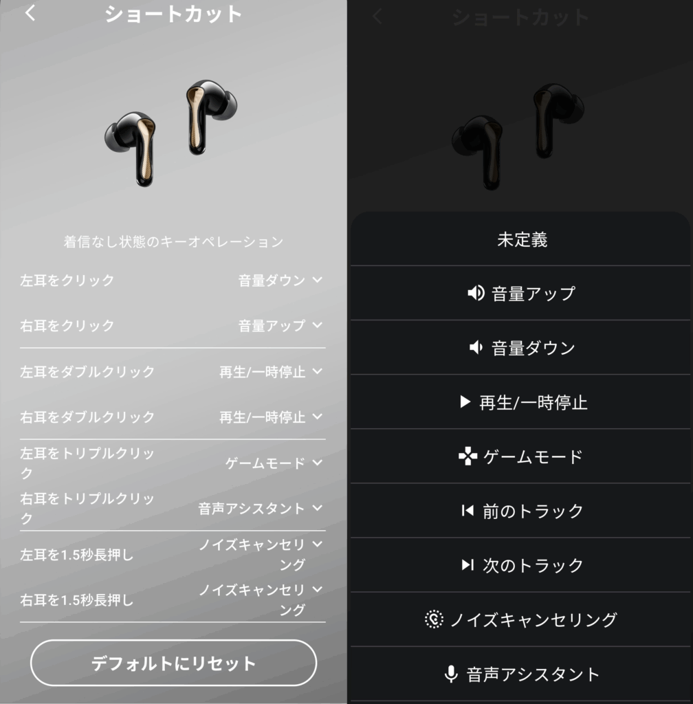 例えば、「クリック」「ダブルクリック」「トリプルクリック」「1.5秒長押し」の4項目あるし、それが左右で独立させれるから、自分好みに8通り設定できる。設定できる内容は、画像右側の内容なんだけど、音量のアップダウンもあるし必要なものは網羅されてる。